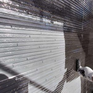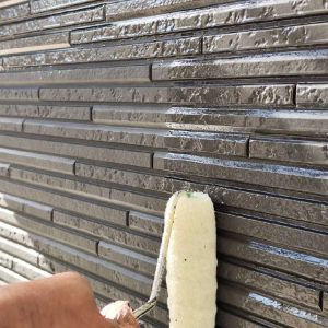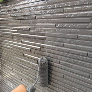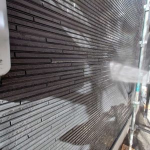 外壁塗装工事は、いきなり塗るのではなく、まず高圧洗浄で外壁表面の汚れやコケ、古い塗膜をしっかり落とします。その後、下塗り作業を行い、上塗り塗料がしっかり密着する下地を整えました。