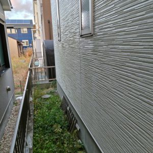 また、外壁表面には雨だれ汚れや黒ずみも点在しており、日当たりや風通しの条件によってはコケの付着も多く見られました。特に北面や湿気が溜まりやすい箇所は、コケや汚れが根を張るように広がりやすく、放置すると美観だけでなく外壁材の傷みにつながりやすくなります。