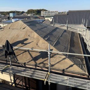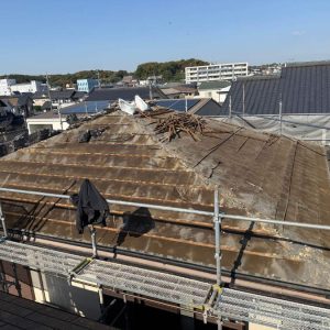 既存の屋根材と下地(野地板)をすべて撤去し、新しく作り直す工事です。
