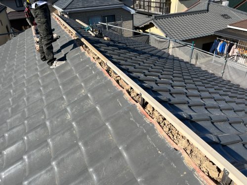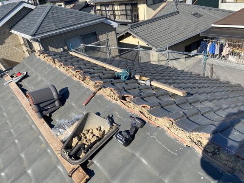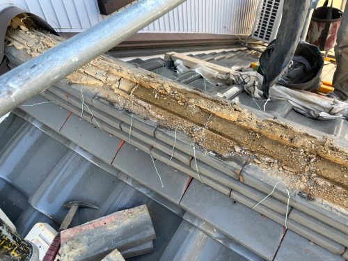 まずは屋根の一番上の棟と呼ばれる部分の瓦を撤去し、瓦の中の土などもしっかりと綺麗に撤去します。