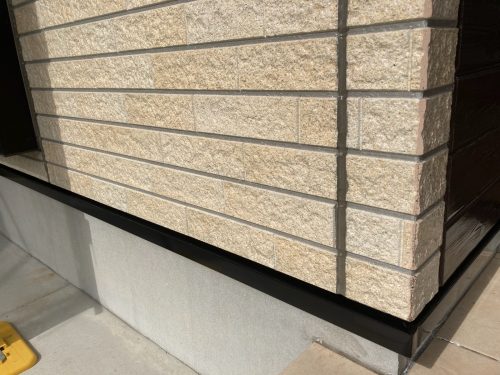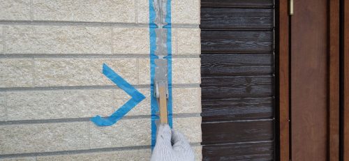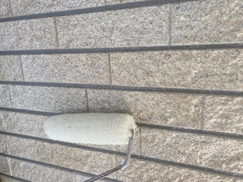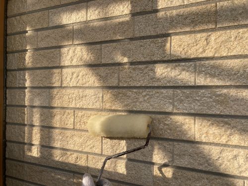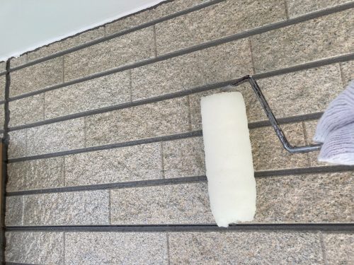 今回タイル柄の外壁にはクリヤー塗装というマニキュアのトップコートのような透明タイプの塗装を行いました。