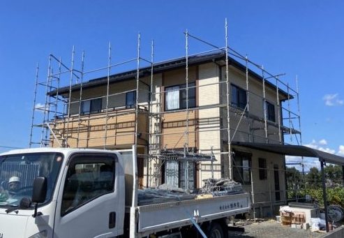 足場組が始まる前にご近隣の方に挨拶を行わせて頂きました。こちらのお宅は敷地が広いということもあり、スムーズに足場を組むことができました。
