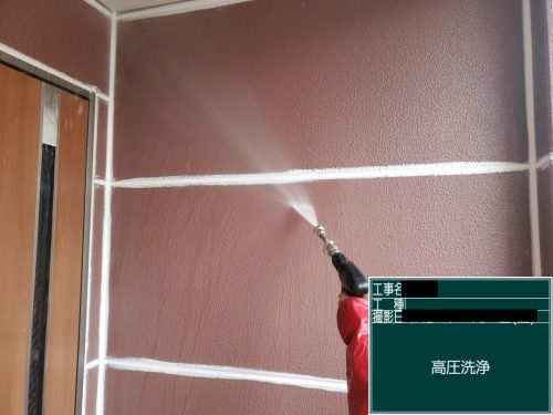こちらの物件は、表面の防水塗膜が劣化して色褪せが見られている状態だった為これから施工する塗料の密着をよくする為に旧塗膜を丁寧に洗い流ししました。