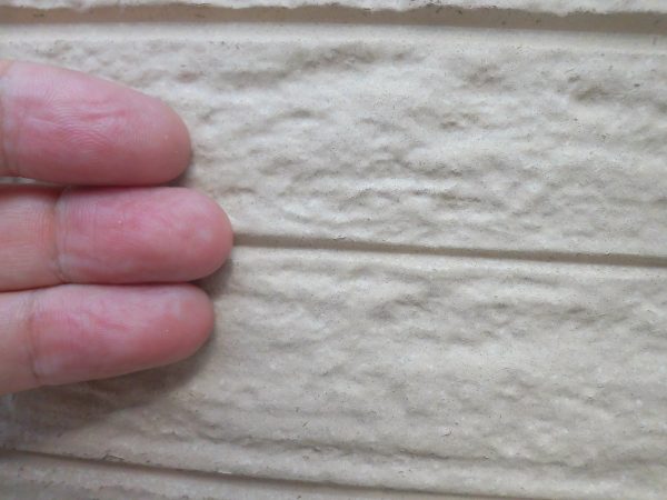 外壁はサイディングボードで、表面にはチョーキング現象が発生していました。チョーキングとは、塗装面が劣化して白い粉が浮き出る現象で、これは塗膜が紫外線や雨風によって劣化している証拠です。チョーキングが進行すると、外壁の保護機能が弱まり、外部からの湿気や水分が壁内に浸透するリスクが高くなります。