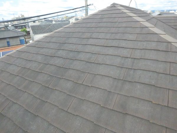 屋根はスレート材が使用されており、全体的に色褪せが進んでいました。スレート屋根は丈夫で耐久性が高いものの、塗膜が劣化すると防水性が低下し、紫外線や雨水によるダメージを受けやすくなります。特に、屋根の色褪せが目立つことで、紫外線による劣化が進行していることがわかります。