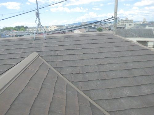 屋根はスレート材が使用されており、全体的に色褪せが進んでいました。スレート屋根は丈夫で耐久性が高いものの、塗膜が劣化すると防水性が低下し、紫外線や雨水によるダメージを受けやすくなります。特に、屋根の色褪せが目立つことで、紫外線による劣化が進行していることがわかります。