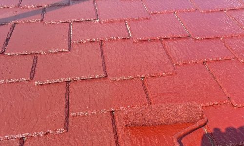 屋根材に塗料がしっかり定着するよう、下塗りを2度行いました。