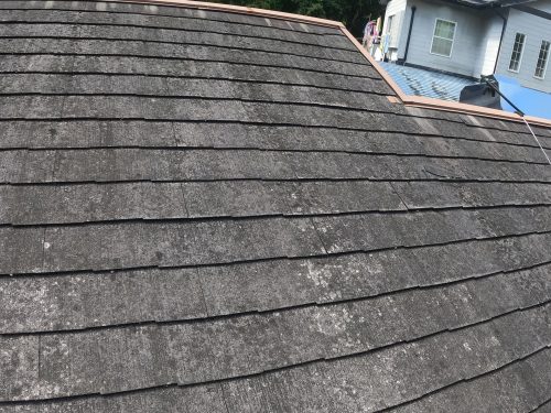 苔が屋根全体に広がっており、見た目だけでなく、屋根材の劣化も進行しています。