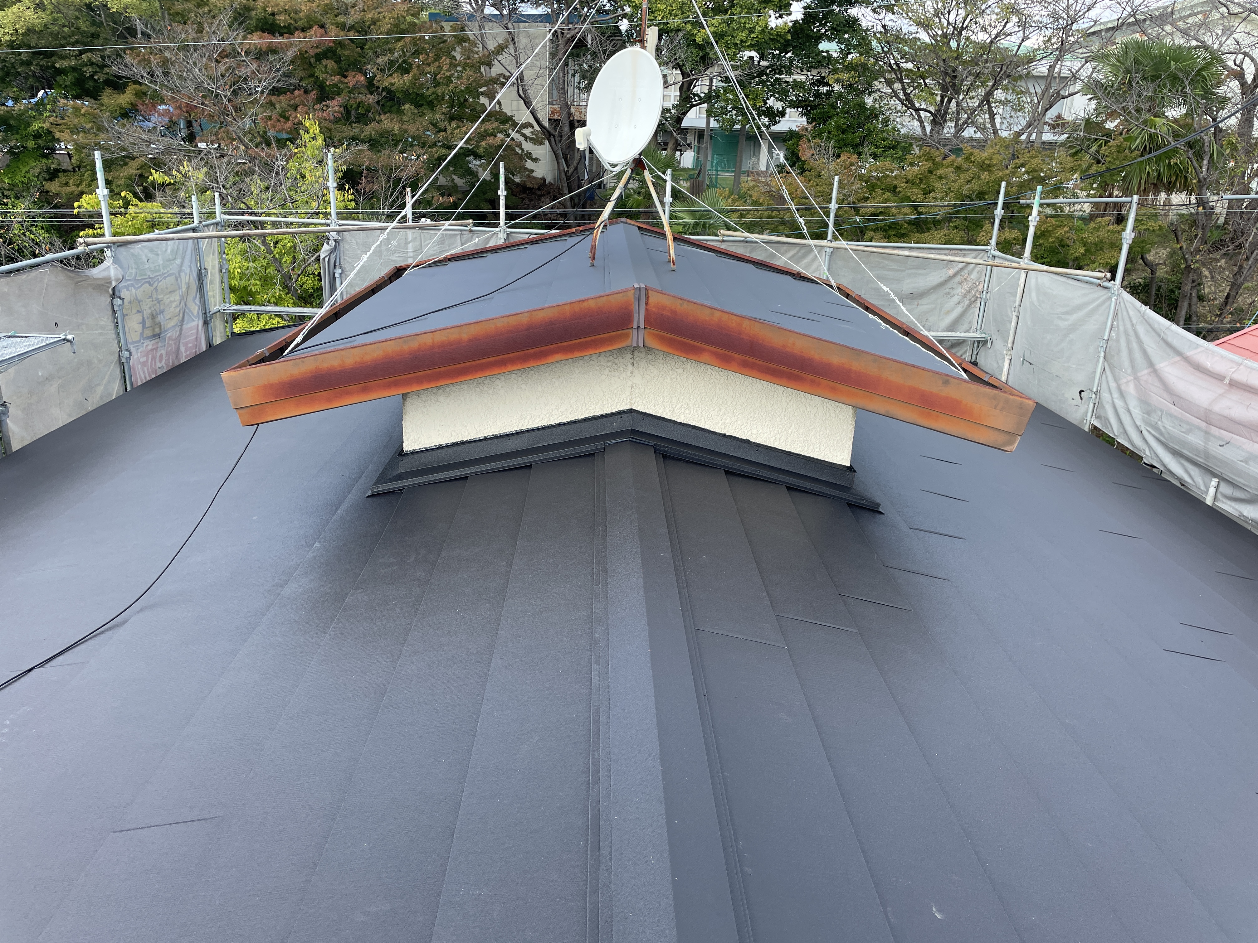 防水シートの上から新しい金属屋根材を重ねて固定。職人が丁寧に施工し、美しい仕上がりを目指しました。