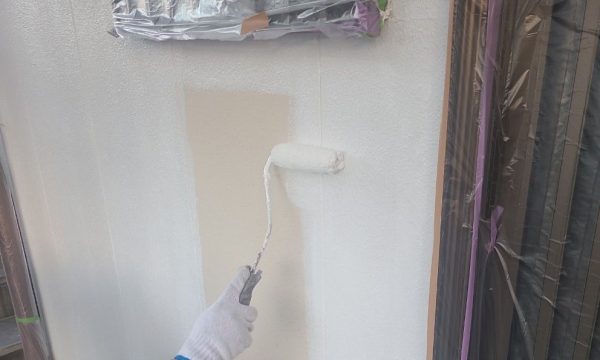 まず、下塗りをしっかりと行い、外壁に塗料が密着するようにしました。その後、上塗りを重ねていきます。RHピュアフレック4Fは、適切な塗布量を守ることでその特性を最大限に発揮するため、職人の経験と技術が光る部分です。