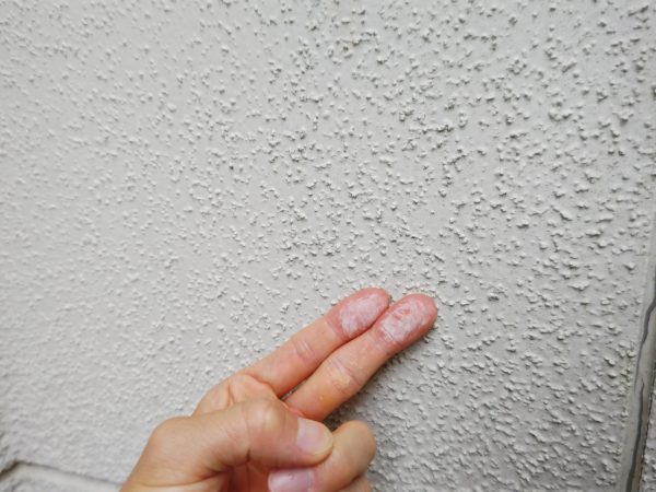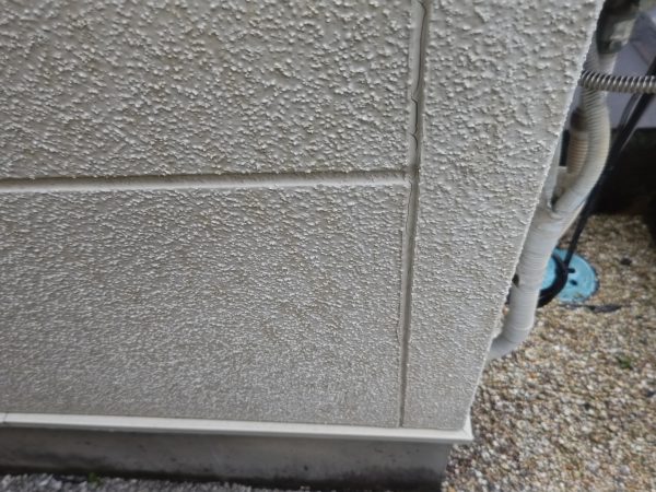 さらに、塗膜の劣化によるチョーキング現象(手で触ると白い粉がつく現象)が見られ、シーリング材には亀裂が発生していました。これらは外壁材そのものの保護性能が低下しているサインです。