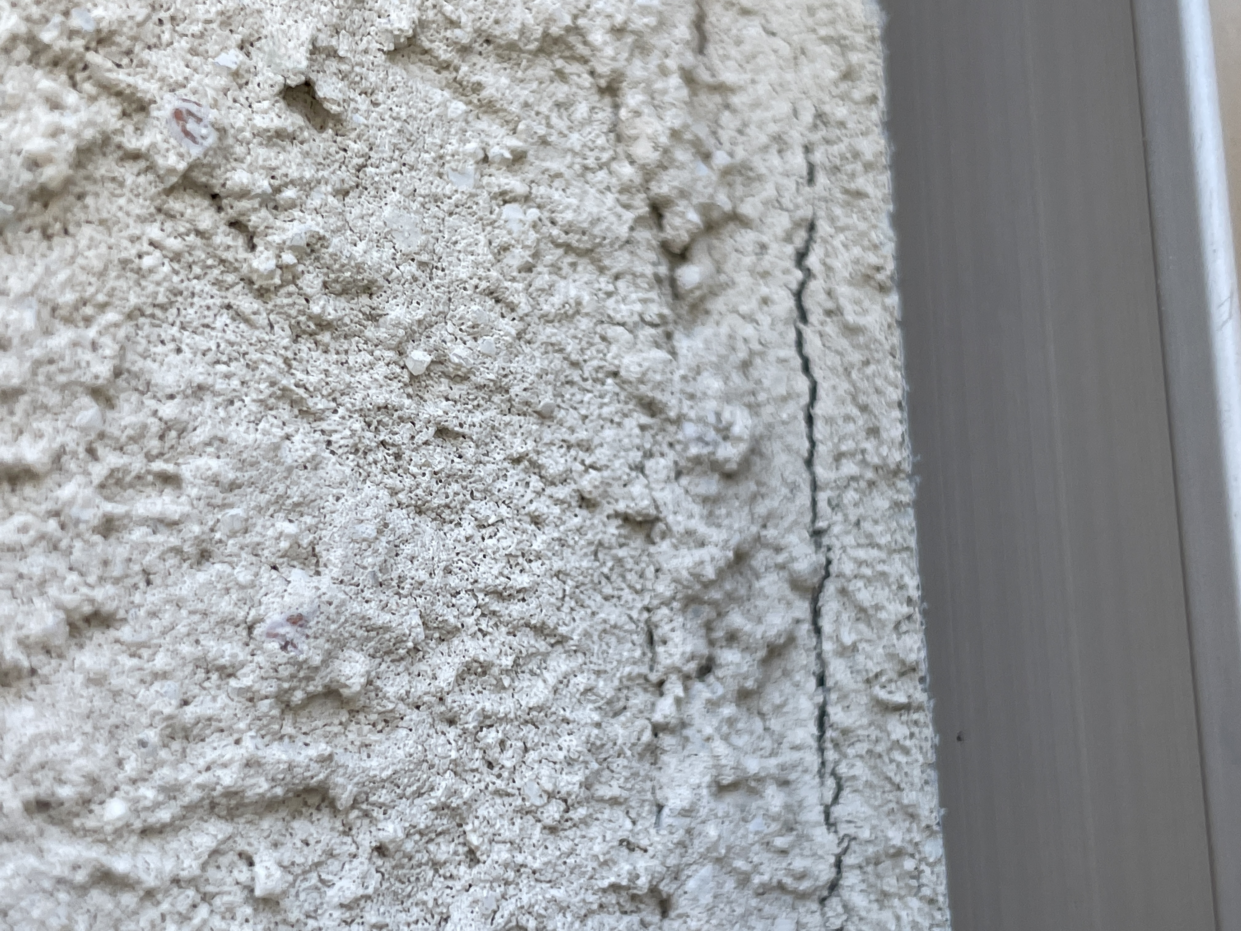 まず最初に目に入ったのは、モルタル壁に見られるひび割れです。外壁全体にひび割れが数ヶ所確認でき、放置しておくと水分が侵入し、さらに劣化が進んでしまう恐れがあります。