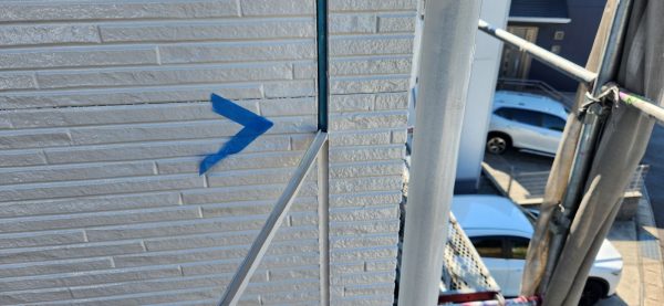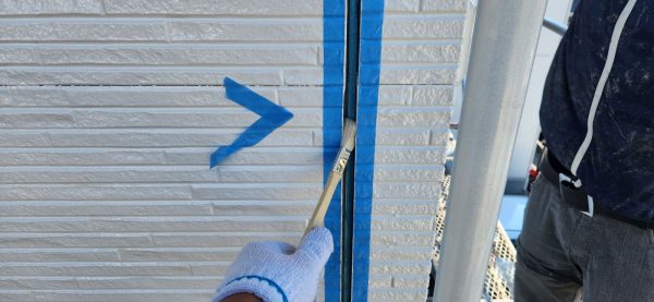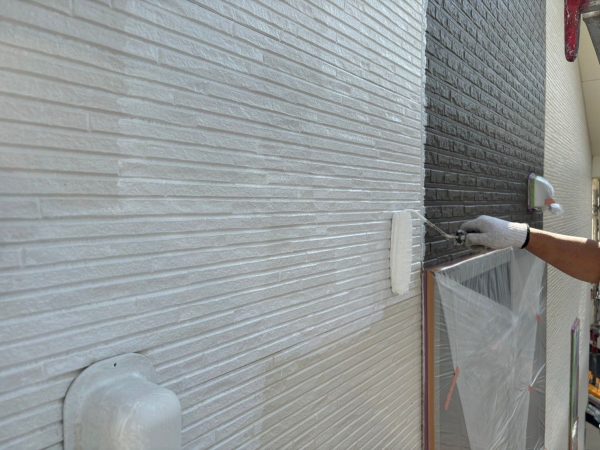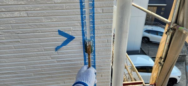 まず、外壁塗装の第一歩として、シーリングの補修作業を行いました。サイディング外壁の場合、シーリングの劣化が建物の耐久性に影響するため、しっかりと補修することで雨漏りやひび割れのリスクを防ぎます。