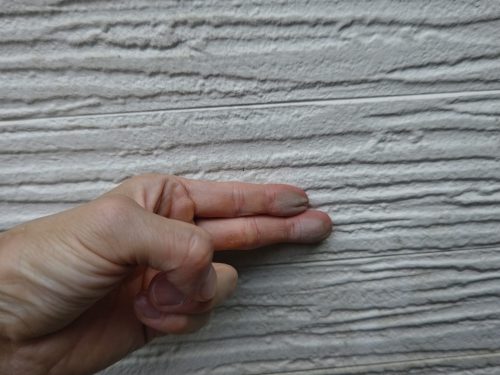 さらにお客様のお話の通り、手で外壁を軽くこすってみると、白い粉のようなものが指につきました。これは「チョーキング現象」と呼ばれる、塗膜の劣化による典型的なサインです。紫外線や雨風の影響で塗料の樹脂成分が分解され、顔料が表面に浮き出てくることで発生します。この現象が見られる場合、防水性が大きく低下している可能性があるため、早めの塗り替えが推奨されます。