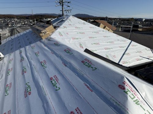 次に、防水シートであるルーフィングを丁寧に張り付けました。これにより、雨漏りのリスクを軽減し、屋根全体の防水性を高めることができます。