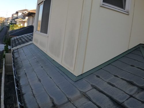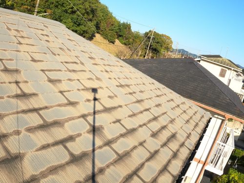 屋根の塗装には色褪せやひび割れ、苔の発生が確認されました。屋根のメンテナンスを行う際には、外壁塗装だけでなく、屋根のケアも非常に重要です。特に苔が生えている状態では、屋根の防水性が低下し、雨水が浸透する恐れがあります。