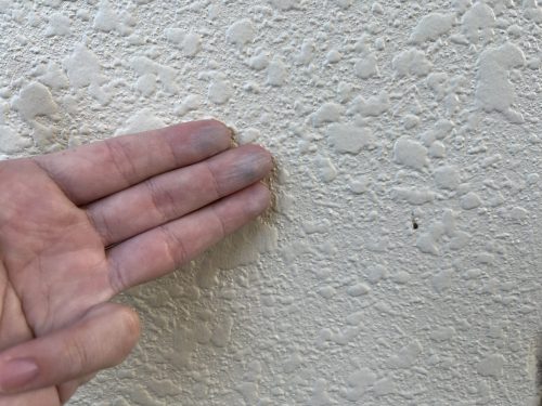 外壁全体にチョーキング現象が見られ、汚れの付着も確認できました。チョーキングは塗膜が劣化しているサインで、放置すると外壁がさらなるダメージを受ける可能性があります。しかし、以前に外壁塗装を経験されているため、大きな傷みは見られませんでした。