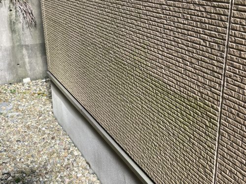 また、チョーキング現象(外壁を触ると白い粉が手につく現象)が発生しており、塗膜の劣化が進行しているサインが見られました。さらに、一部の外壁には苔の付着が確認されました。苔やカビは湿気の多い環境で発生しやすく、美観を損なうだけでなく、外壁の劣化を早める要因となります。