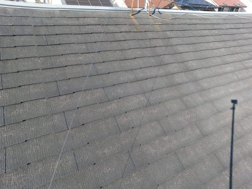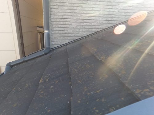 屋根を確認したところ、全体的に色褪せが進行しており、特に北側を中心に苔の発生が見られました。
