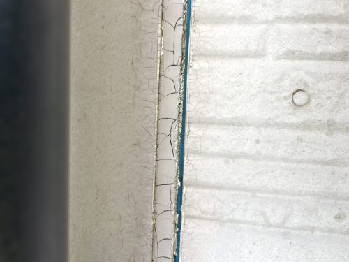 外壁の目地に充填されているシーリング材が硬化し、ひび割れが発生していました。これにより雨水が侵入し、内部の構造材にダメージを与える可能性があります。