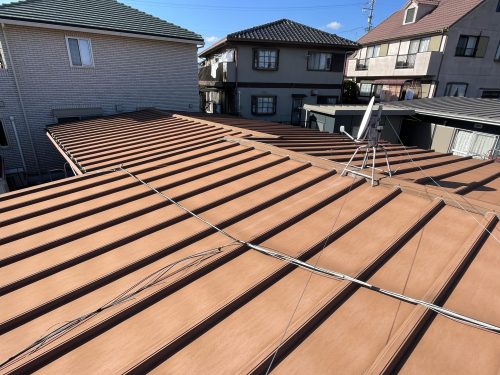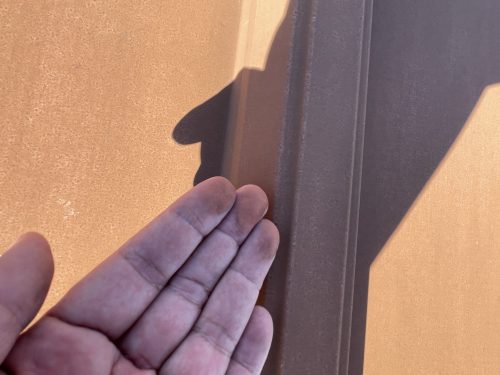 今回のお宅では、折半屋根が使用されていました。屋根全体に色褪せが見られ、手で触ると白い粉が付着するチョーキング現象が発生していました。これは、塗膜が劣化し、防水性が低下しているサインです。放置すると雨漏りのリスクが高まるため、早めの外壁塗装と屋根塗装のメンテナンスが推奨されます。