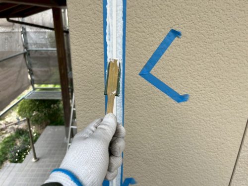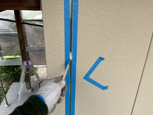 外壁塗装において欠かせないのが、シーリングの補修です。今回の尾張旭市の現場では、外壁の目地(間板目地)は経年劣化によりひび割れや剥がれが目立っていました。