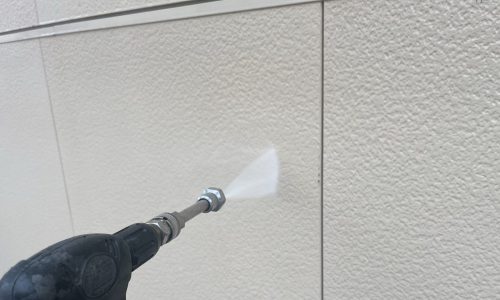 次に、外壁塗装の前処理として欠かせない高圧洗浄を行いました。尾張旭市のお宅では、長年の雨風によって汚れや旧塗膜が外壁に付着していました。