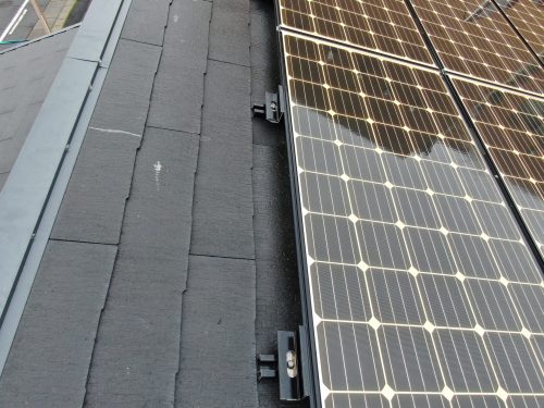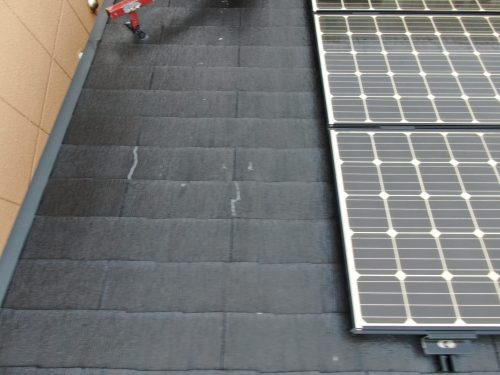 屋根にはスレート材が使用されており、数か所にひび割れ補修の跡が見られました。現時点で雨漏り等の症状は見られませんでしたが、塗装前に再度しっかりと補修することで、将来的なトラブルを未然に防ぐことができます。