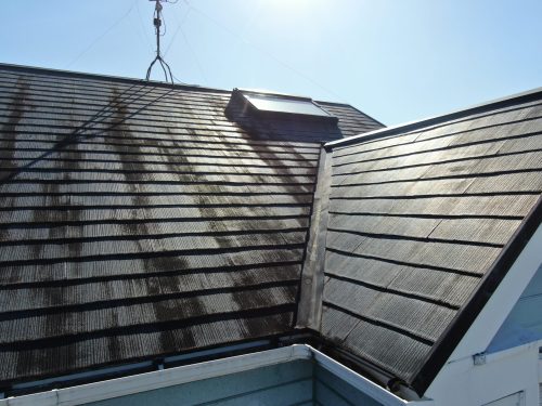 屋根についても、スレート瓦の表面に色褪せや苔、汚れの付着が確認され、塗膜の防水性がほぼ失われていると判断できました。