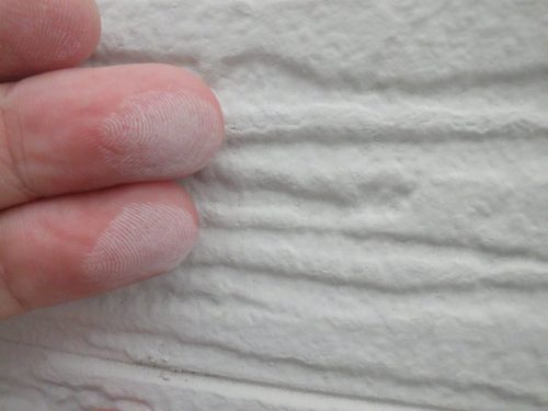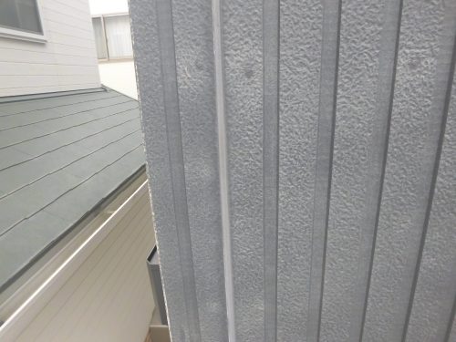 外壁を手で軽くこすると白い粉がつく状態になっており、塗膜の劣化が進行しているサインでした。これは紫外線や雨風によって塗膜が分解され、保護機能が弱まってきている証拠です。