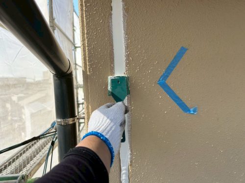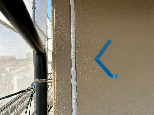 まずはALC外壁の継ぎ目にある既存のシーリング材の上から新しいシーリング材を打ちました。ALCはパネルの継ぎ目から雨水が入りやすいため、この工程は外壁塗装の耐久性を左右する重要なポイントです。弾性・耐候性に優れた高品質シーリング材を使用することで、長期にわたり雨水の侵入を防ぎます。