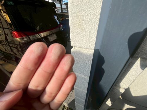 外壁表面を指で触れると白い粉が付着する状態で、塗膜の防水性が低下しているサインです。