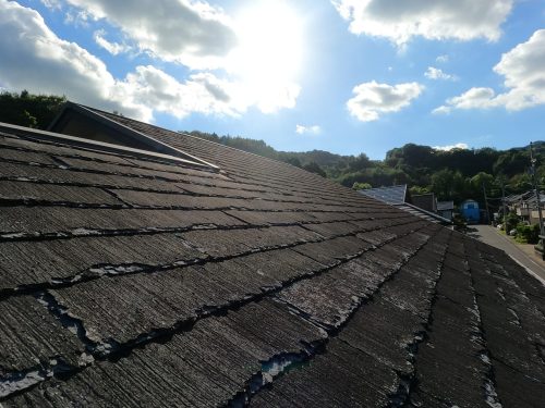 調査の結果、屋根材には「パミール」という種類が使用されており、表面の剥がれが目立っていました。パミールは経年劣化によって屋根材自体の表層が剥がれてしまう特徴があり、屋根塗装で表面を整えても、内部から剥がれが進行するため、長期的な保護にはつながりません。