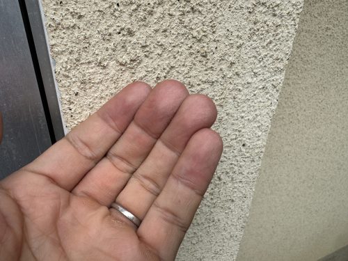 外壁を手で触れると白い粉が付着する「チョーキング現象」が確認されました。これは塗膜が紫外線や雨風で劣化し、防水性が失われているサインです。