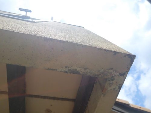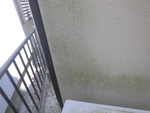 しかし、細かくチェックをしていくと、ベランダに面した外壁部分では塗膜が剥がれている箇所が確認できました。また、北面を中心に日当たりや風通しの関係でコケの付着も見受けられました。コケやカビが発生すると外観の美観を損ねるだけでなく、塗膜の耐久性を低下させる要因にもなります。