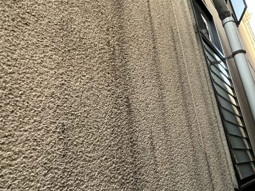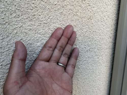 外壁を手で触ると白い粉が付着する状態で、塗膜が紫外線や雨風によって分解されているサインです。