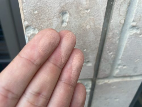 外壁を手で触ると白い粉が付く現象で、塗膜の防水性能が低下しているサインです。また、サッシ周りや目地部分のシーリングも劣化しており、ひび割れや肉やせが進行していました。