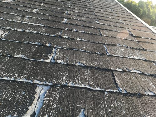 確認したところ、屋根材の表面がめくれてきている状態が見られました。この状態のまま屋根塗装でメンテナンスを行っても、数年で塗装が剥がれてしまう可能性があります。そのため、今回は「屋根カバー工法」をご提案させていただきました。屋根カバー工法とは、既存の屋根材の上から新しい屋根材を重ねる方法で、撤去費用を抑えつつ耐久性を向上させられる点が大きなメリットです。特に築年数が経過しているお住まいにはおすすめの工法です。