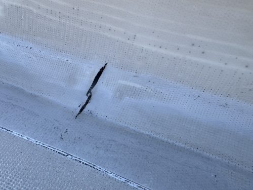 今回の調査では屋上防水のシート部分に亀裂が見られました。屋上は建物の最上部に位置し、雨や紫外線を直接受ける場所です。そのため防水層の劣化は雨漏りにつながりやすく、放置してしまうと室内への浸水や建物内部の腐食を引き起こす可能性があります。