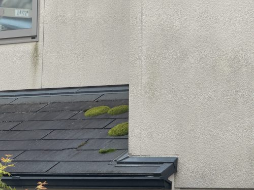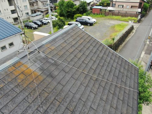 スレート屋根の表面では、塗膜の色褪せ・サビの付着・コケの発生が確認できました。