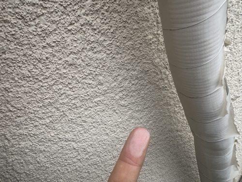 外壁を確認したところ、全体的に日当たりの良い面でチョーキング現象(手で触れると白い粉が付く状態)が発生していました。