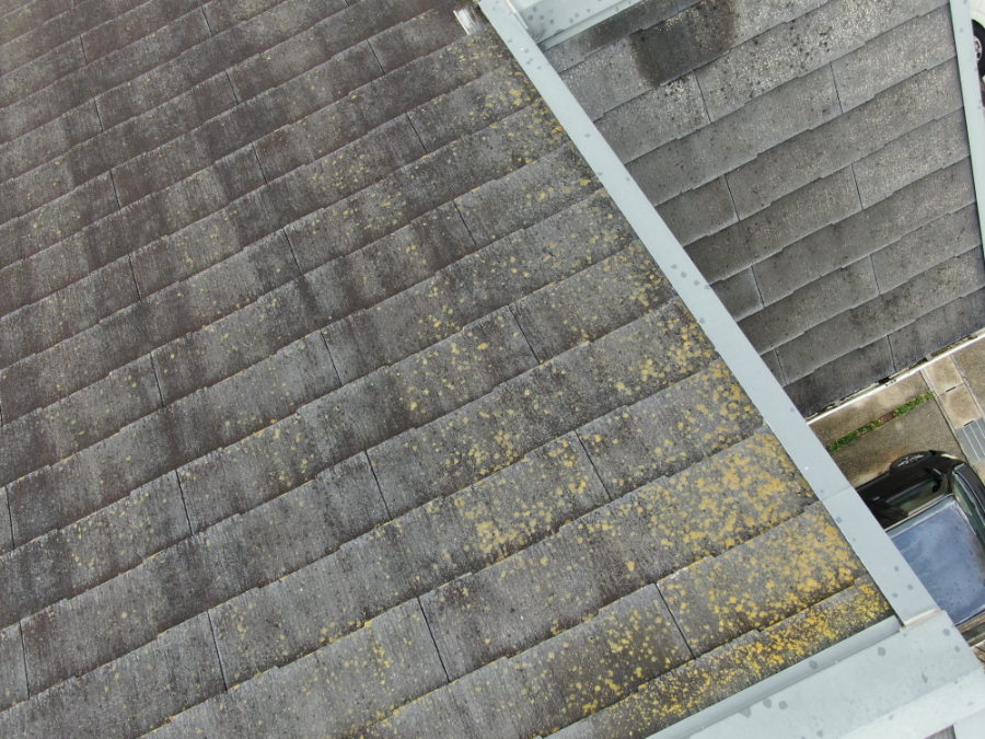 屋根は全体的に色褪せが進行しており、特に日当たりの悪い面を中心にコケやカビの発生が確認できました。
