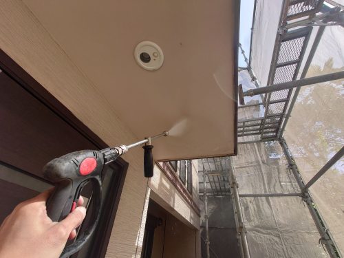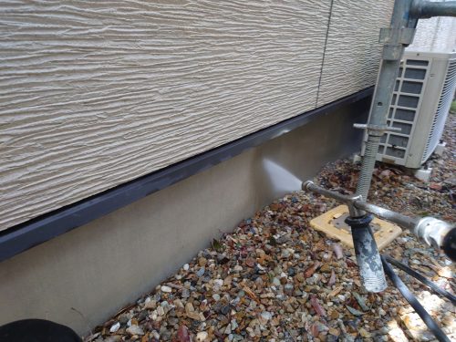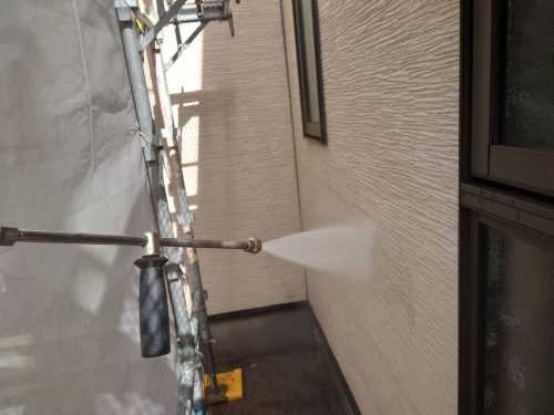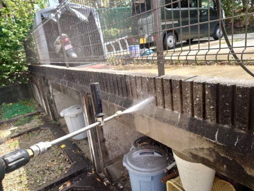 次に外壁の表面に付着した汚れ、ホコリ、苔、旧塗膜などを業務用の高圧洗浄機で徹底的に洗い流しました。塗料の密着性を高め、長持ちする塗装に仕上げるため、この工程を丁寧に行います。