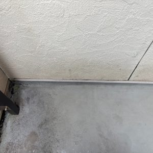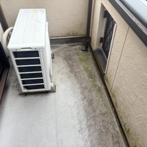 ベランダ部分では、床面に苔(コケ)が発生している状態でした。こちらのベランダはFRP防水が施工されていましたが、経年により防水層のトップコート効果が薄れ、防水性能が低下していると考えられます。