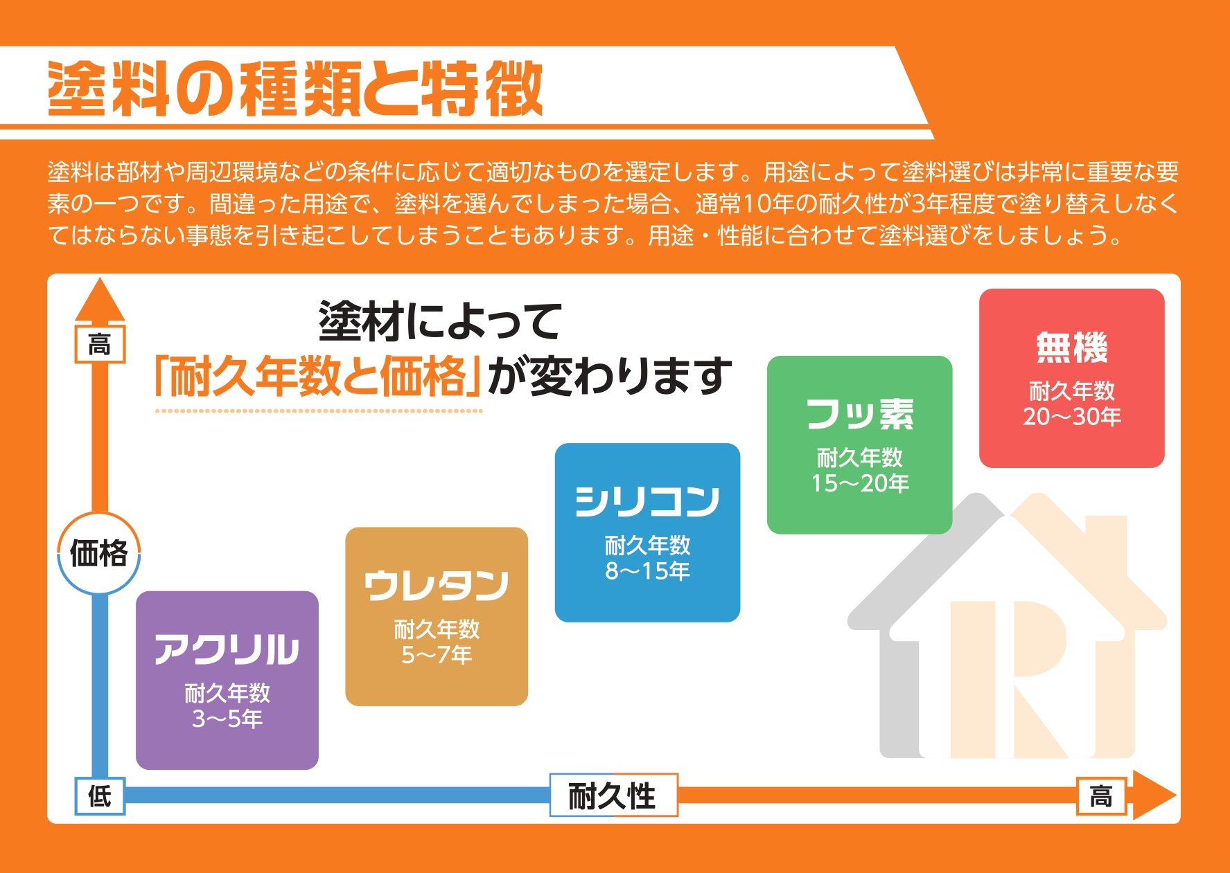 間違った用途で、塗料を選んでしまった場合、通常10年の耐久性が3年程度で塗り替えしなくてはならない事態を引き起こしてしまうこともあります。用途・性能に合わせて塗料選びをしましょう。