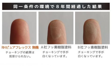 宮古島で実証実験を実施しました。RHピュアフレックス無機は多層なバリアにより、従来の塗料よりもラジカルを抑え込み、チョーキング現象を制御し、指でこすっても大きく白くなるような変化がないため、塗替えサイクルを伸ばすことができます。