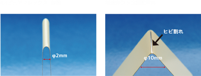 従来のフッ素樹脂塗料はφ10mm の曲げ試験でひびが入りますが、RH ピュアフレックス 無機は、φ2mm でもひび割れが起きません。