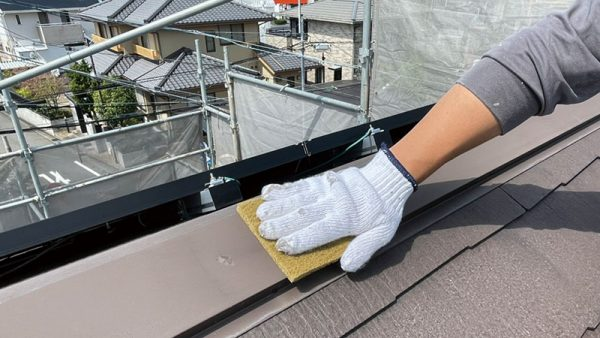 棟板金やケラバ板金などの鉄部のサビを落としたり高圧洗浄で落としきれなかった汚れを手作業で研磨します。