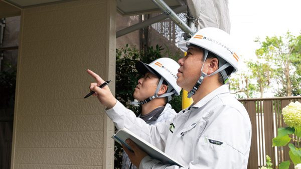 足場解体前にお客様と立ち合いのもと、細かい塗料の吹き残しや塗り残し、塗りムラが無いか、確認作業を行います。双方でしっかりとしたチェックをして工事完了となります。