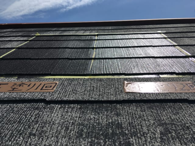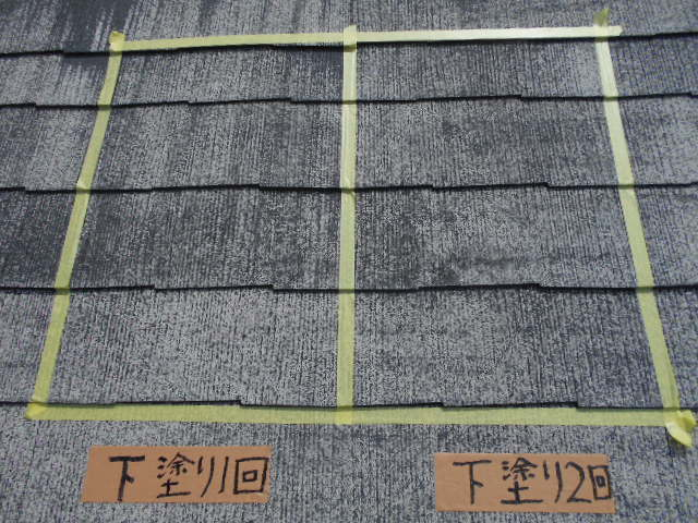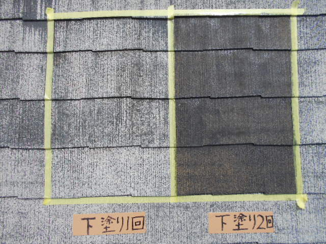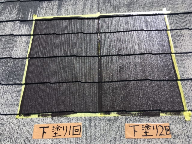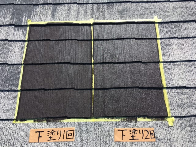屋根の塗装はこだわりの4回塗装です。下塗りを1回塗布した場合と、2回塗布した場合の比較画像です。